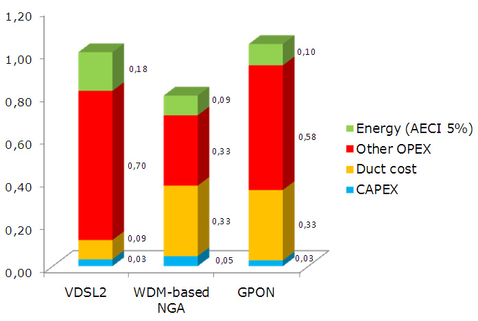 For ducting, it is assumed that VDSL already has fibre to the cabinet and the copper linking the user, whereas for optical access – WDM-PON and GPON – the feeder fibre is present but distribution fibre must be added to connect each home and enterprise. “There is also a certain upgrade of the feeder fibre required but it is 5 percent of the distribution fibre costs,” says Grobe. Hence the ducting costs of GPON and WDM-PON are similar and higher than VDSL.