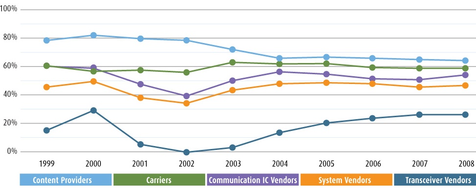 Comparing the gross margin performance of the industry layers that make up the telecom industry, optical transceiver vendors are last (see chart at the top of the page). Gross margin is an efficiency measure as to how well a vendor turns what they manufacture into income. Companies such as Cisco Systems have impressive gross margins of 75%. “You have to own a market, to have something unique to maintain such a margin,” says Kozlov.