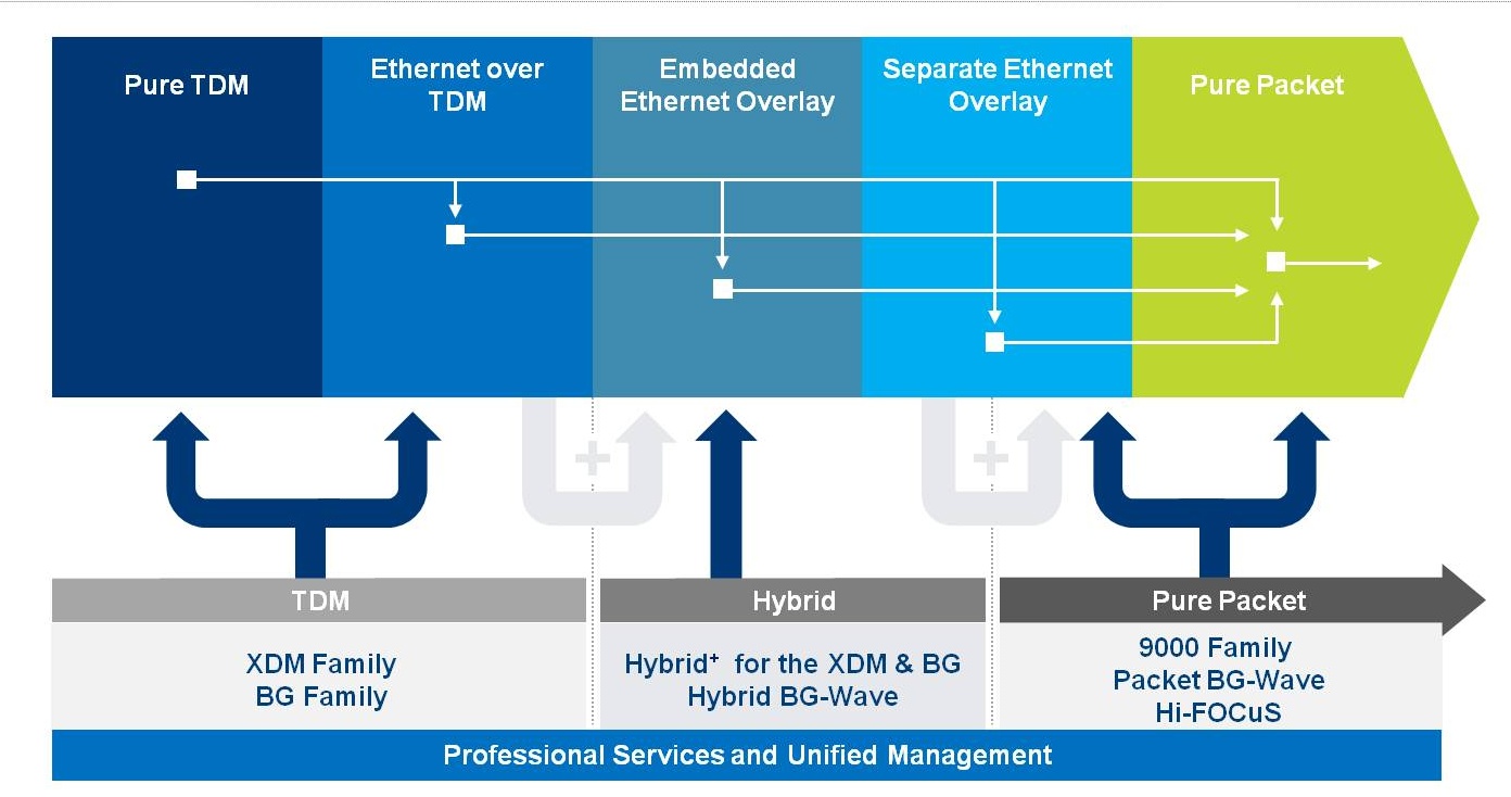 With Ethernet overlay, an Ethernet network runs alongside the TDM network. The two can co-exist within a common network element, what ECI calls embedded Ethernet overlay, or separately using distinct TDM and packet switch platforms. And when an operator adopts all-packet, legacy TDM traffic can be carried over packets using circuit emulation pseudo-wire technology.