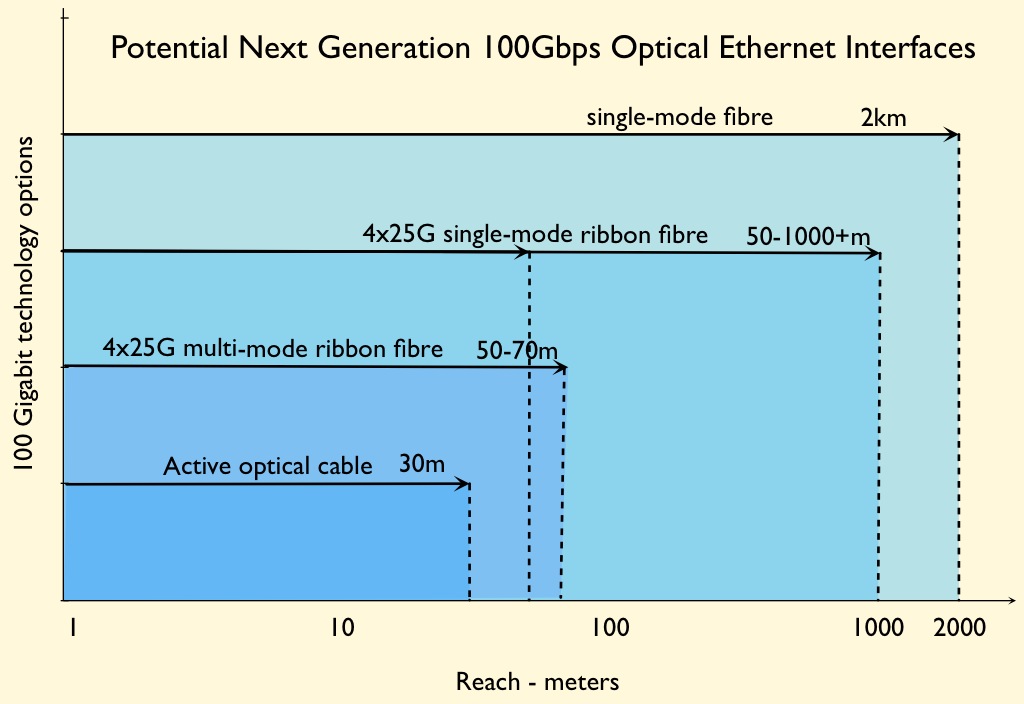 Anderson says there is a general agreement to define a 4x25Gbps multi-mode fibre optical interface. But the issues of reach and multi-mode fibre type (OM3, OM4) are still being studied.