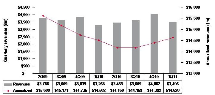 Quarterly market revenues, global optical networking (1Q 2011). Source: Ovum