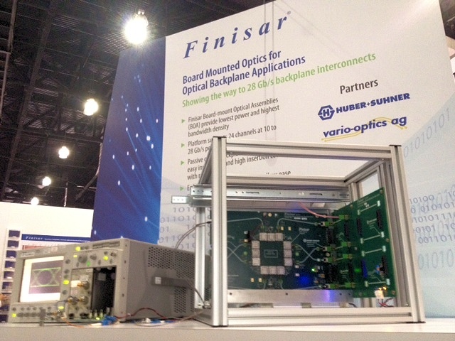 Finisar demonstrated its own VCSEL-based board mount optical assembly – also an optical engine – to highlight the use of the technology for future optical backplanes.