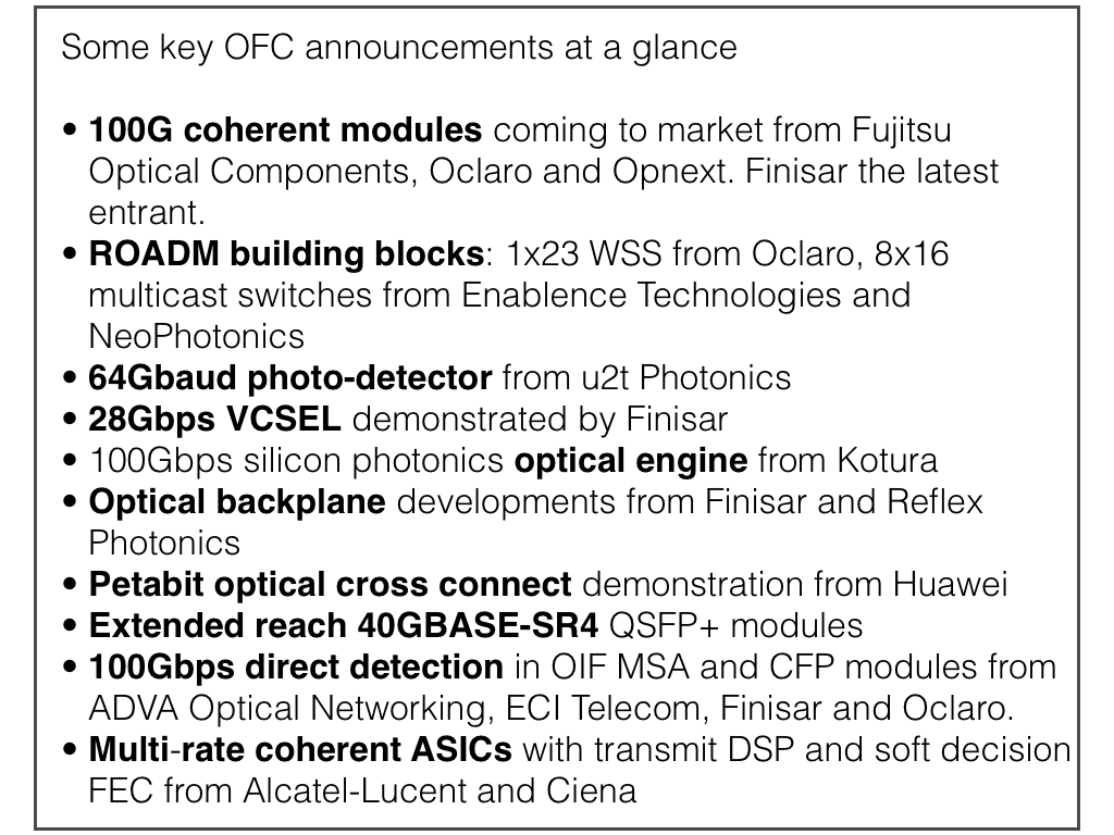 A round-up of some of the main announcements and demonstrations at the recent OFC/NFOEC 2012 exhibition and conference.
