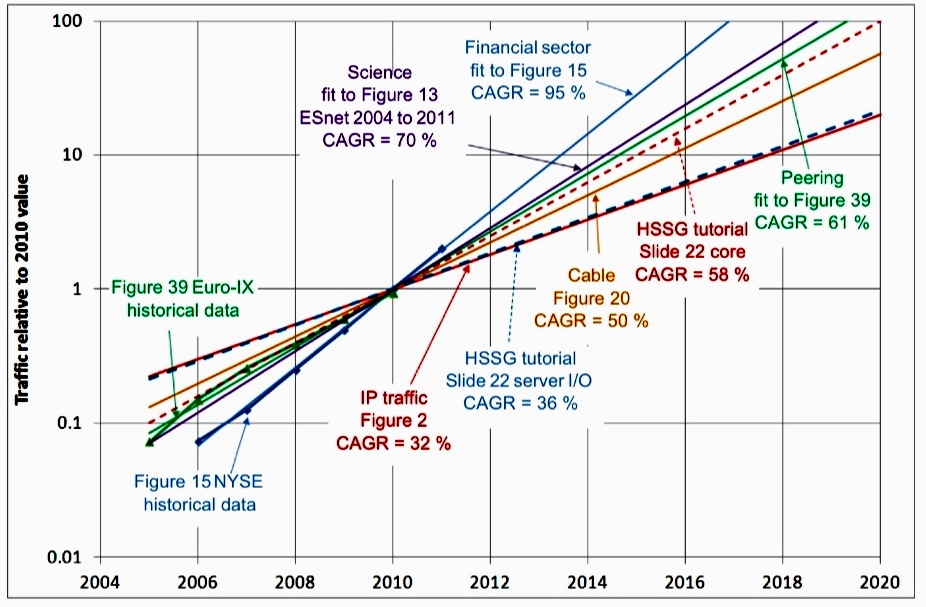 The IEEE 802.3 Bandwidth Assessment Ad Hoc group, which produced the report that highlights the hundredfold growth in bandwidth demand between 2010 and 2020, studied several sectors besides core networking and data centre equipment such as servers. These include Internet exchanges, high-performance computing, cable operators (MSOs) and the scientific community.