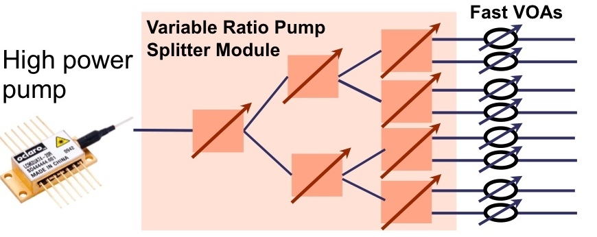The pump splitter is also controlled using a complex algorithm to set the required individual amp power levels. The splitter, being PLC-based, has a relatively slow switching time – some 1 millisecond. Yet transients that need to be suppressed can have durations of around 50 to 100 microseconds. This requires the addition of fast variable optical attenuators (VOAs) to the design that introduce their own insertion losses.