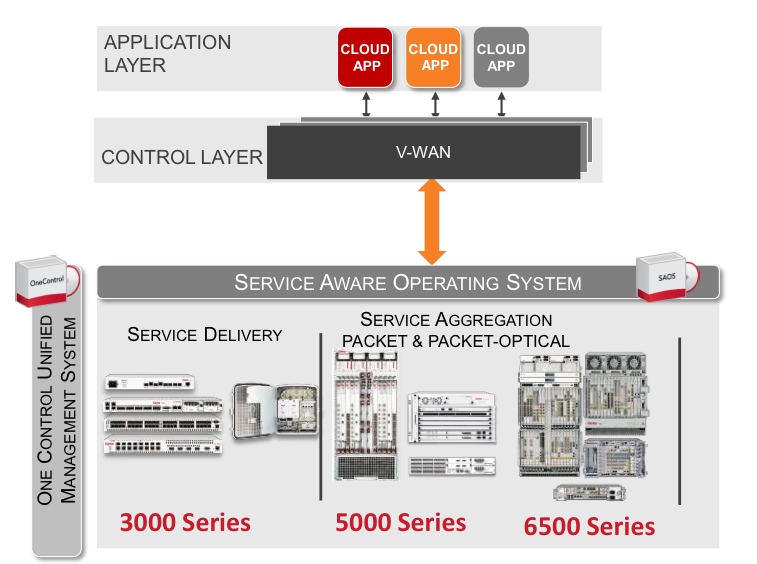 Ciena has a virtual wide-area network (VWAN) control layer that resides above the networking layer that abstracts the hardware and through which software applications can be executed (see chart).