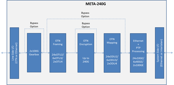 The Meta-240G frames IP router traffic using OTN before passing the traffic to the transport network. Line-rate encryption is included on-chip to secure traffic between data centres and traffic in the cloud.