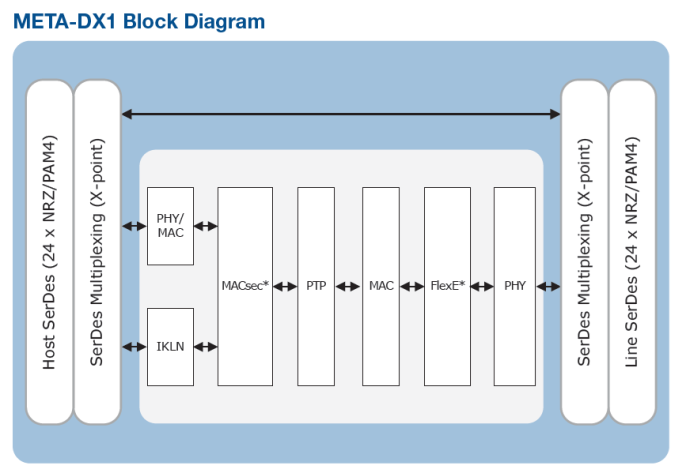 Other features the Meta-DX1 supports besides MACsec encryption include gearbox functionality that translates between 10 and 25 gigabits non-return-to-zero (NRZ), and between 25-gigabit NRZ and 56-gigabit 4-level pulse-amplitude modulation (PAM-4).