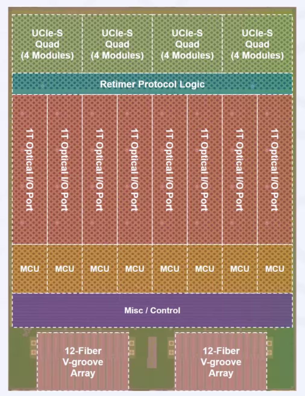 The chiplet uses eight 1Tbps optical ports, each supporting 512Gbps channels per direction. Each wavelength carries a 32Gbps signal and using 16 silicon photonics micro-ring resonators, there are 16 wavelengths per fibre.