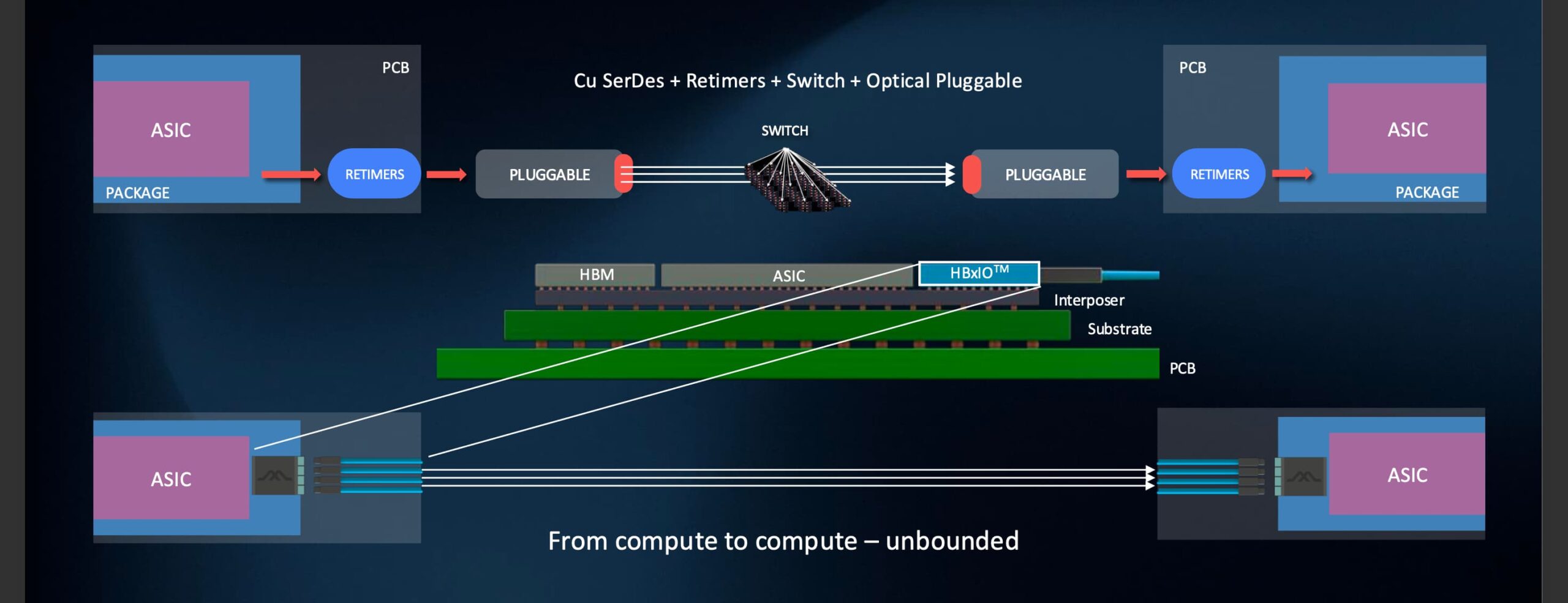 Beyond that, system architects have flexibility: they can add optical or electrical switches for dynamic workloads, or extend to a multi-cluster across 500 meters.