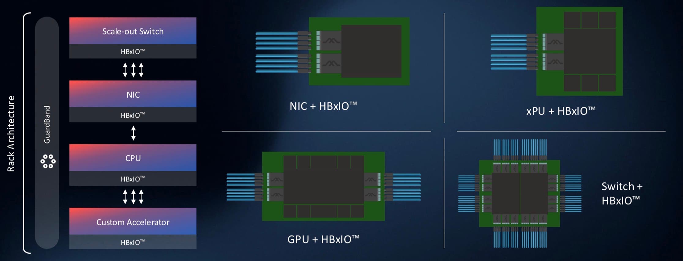 The first-generation HBxIO delivers 25.6 Terabit-per-second (Tbps) of bi-directional bandwidth – 12.8Tbps in each direction – achieved using 200 gigabit-per-second optical lanes.