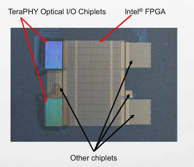 For the Intel FPGA system-in-package, two TeraPHY chiplets are used, each supporting 16Gbps channels such that the chiplet’s total optical I/O is up to 5.12 terabits.