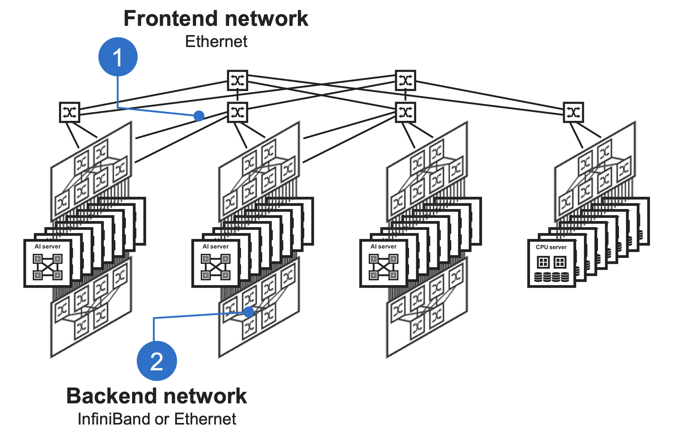 Two main networks – the front-end and backend – are used in data centres supporting AI workloads.