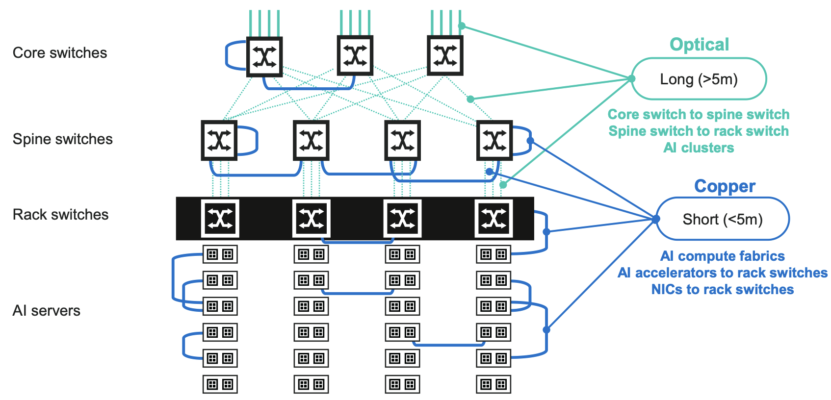 Compute servers using the latest processors and AI accelerator chips have increasing input-output (I/O) requirements. This is causing interface speeds between servers, and between servers and switches, to keep doubling—from 400 gigabits to 800 gigabits and soon 1.6Tbps.