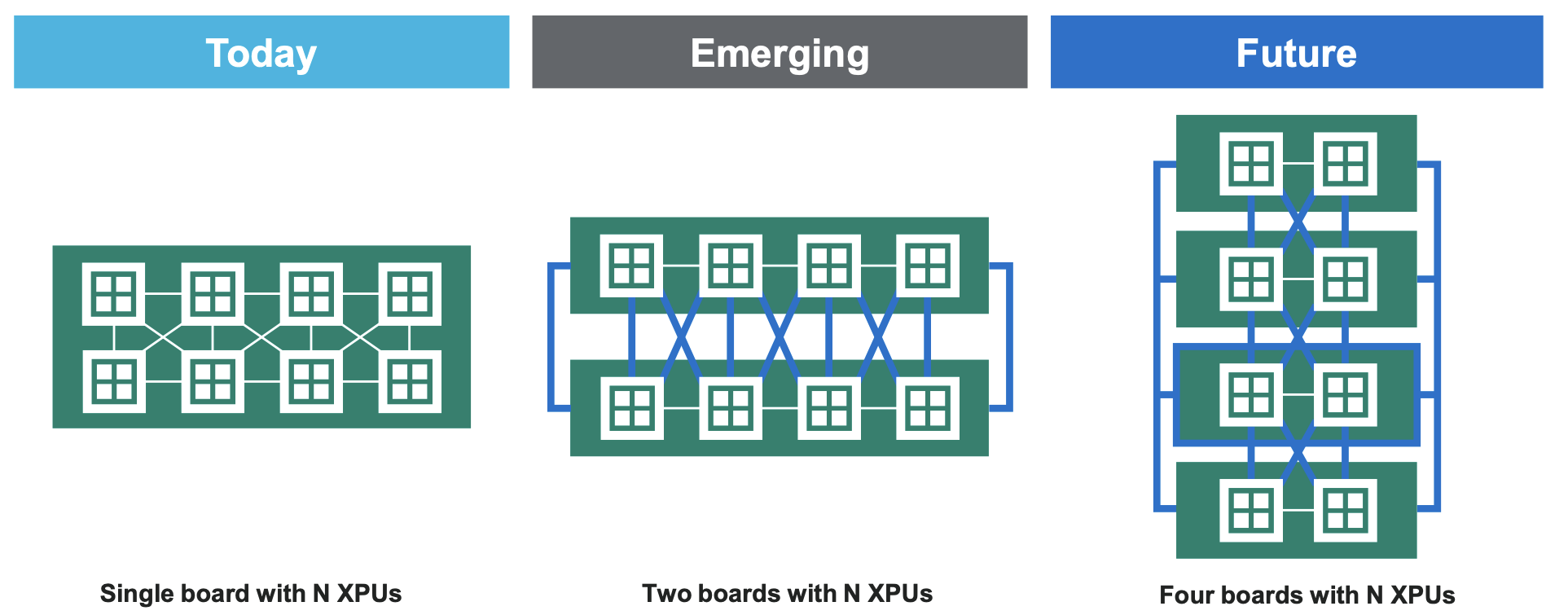 Marvell points out that AI servers are becoming increasingly distributed. The trend is that a board holding N GPUs will become two boards and in future four boards to host the same number of GPUs.