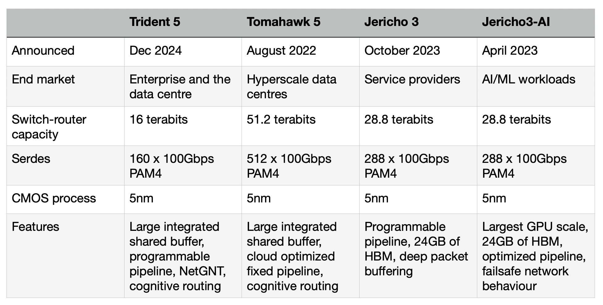 The latest Jericho 3, the 28.8 terabits-per-sec (Tbps) Jericho 3, was announced in September. Broadcom launched the first family device, the Jericho3-AI, earlier this year; a chip tailored for AI networking requirements.