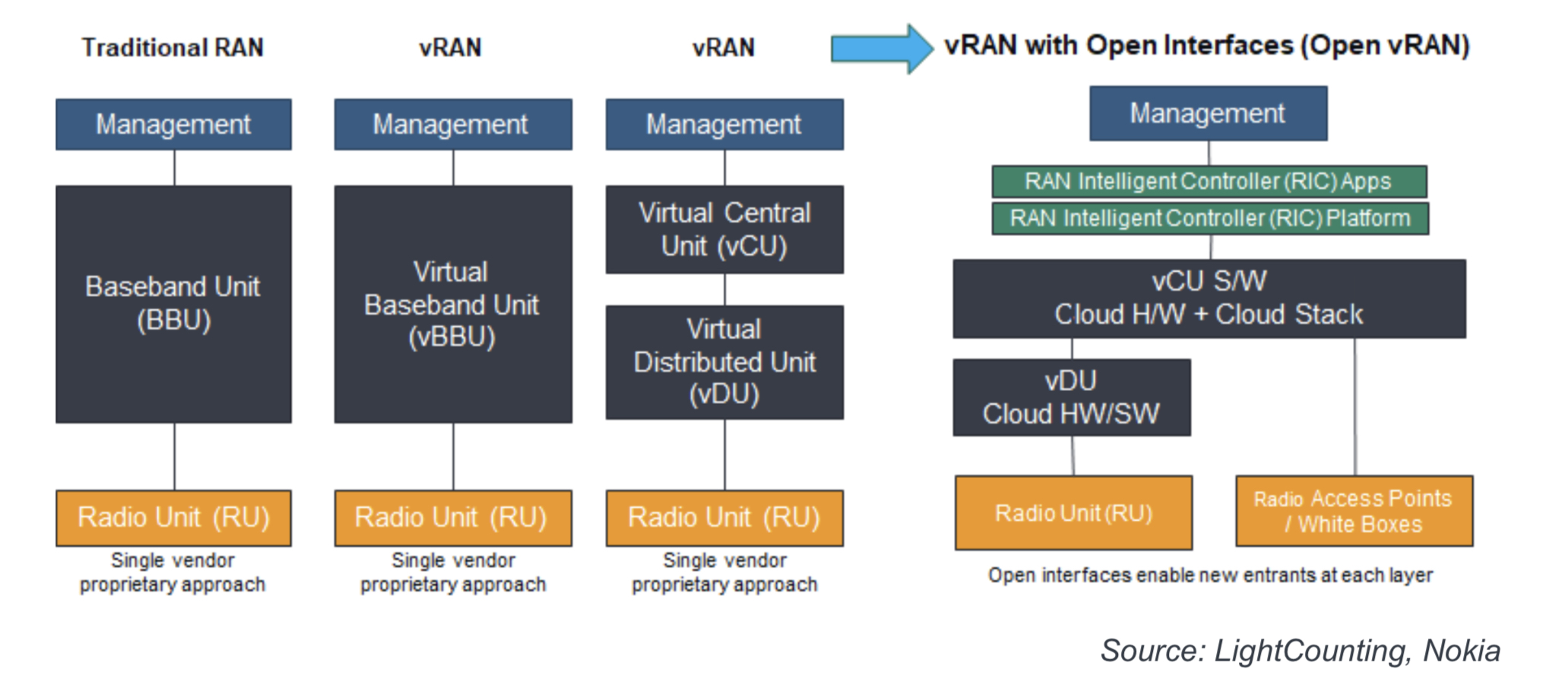 Traditional RANs use a radio unit and a baseband unit from the same equipment supplier. Such RAN systems use proprietary interfaces between the units, with the vendor also providing a custom software stack, including management software.