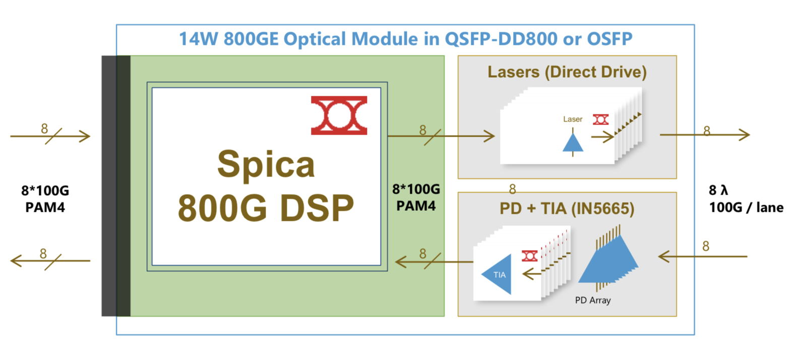 The Spica device supports 2×400-gigabit or 8×100-gigabit module designs and enables 800-gigabit or 8×100-gigabit optical interconnects. The 800-gigabit form factors used are the QSFP-DD800 and the OSFP. Inphi says both designs consume under 14W.