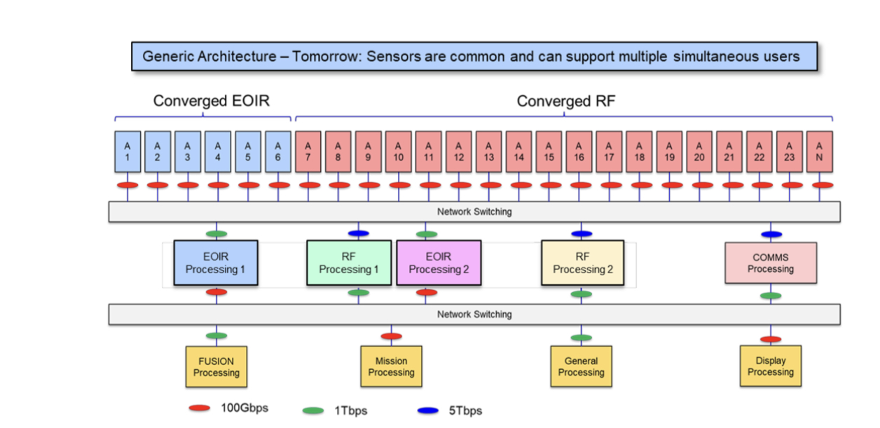 A representation of current systems is shown above. Here, custom designs comprising sensors, analogue circuitry, and processing pass data to mission-processing units. The mission equipment includes data fusion systems and displays.