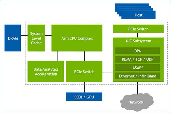 Since the DPU is the server’s networking gateway, it supports PCI Express (PCIe). The PCIe bus interfaces to the host CPU, to accelerators such as GPUs, and supports NVMe storage. NVMe is a non-volatile memory host controller interface specification.