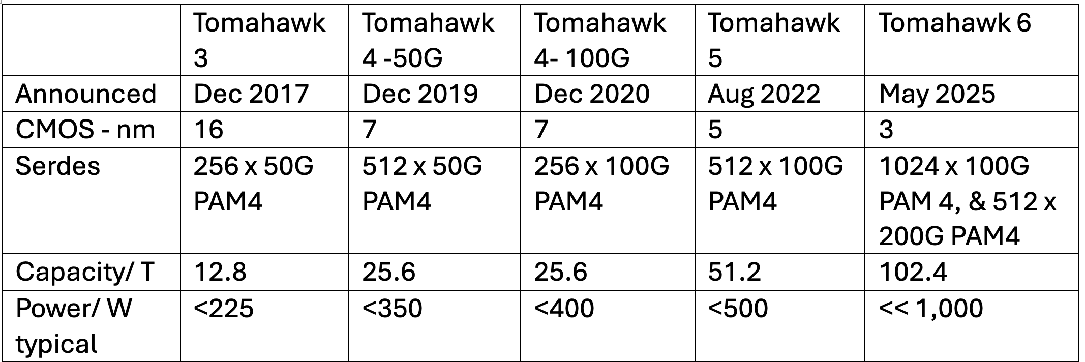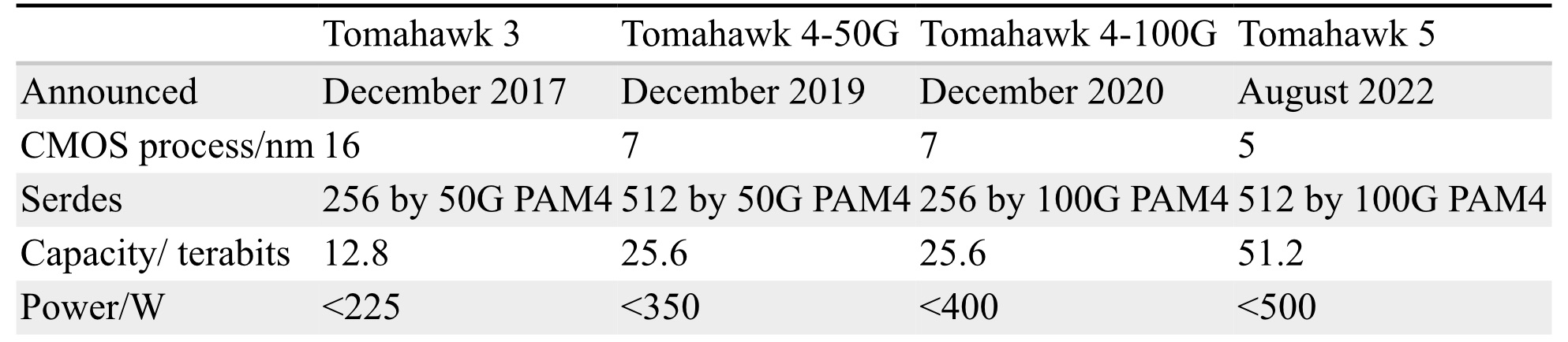Meanwhile, using architectural optimisations, such as automatic clock gating and efficient serdes design, improved power efficiency. What about the delay in announcing the latest Tomahawk switch chip compared to the clock-like 2-year launch date gaps of previous Tomahawk chips? (See table above.)