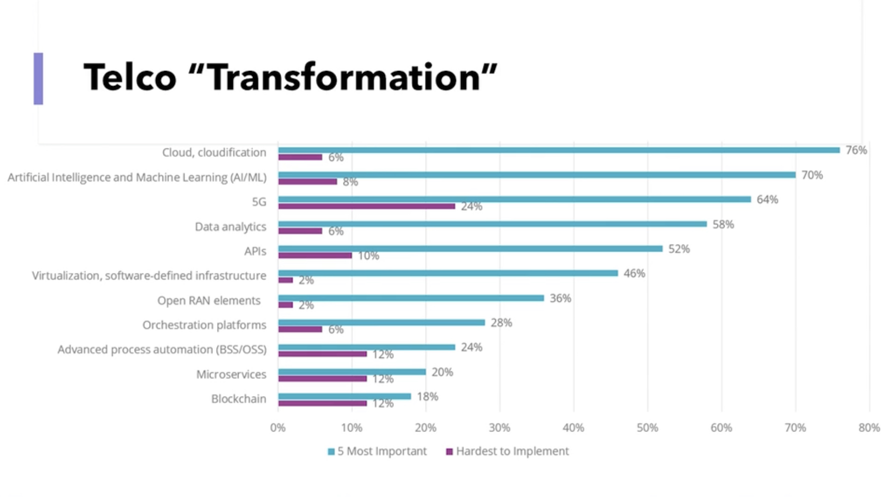 McRae continues down the list, virtualisation and software-defined infrastructure, OpenRAN elements – “not sure what the elements mean” – orchestration platforms, advanced process automation (OSS/BSS), micro-services, and blockchain.