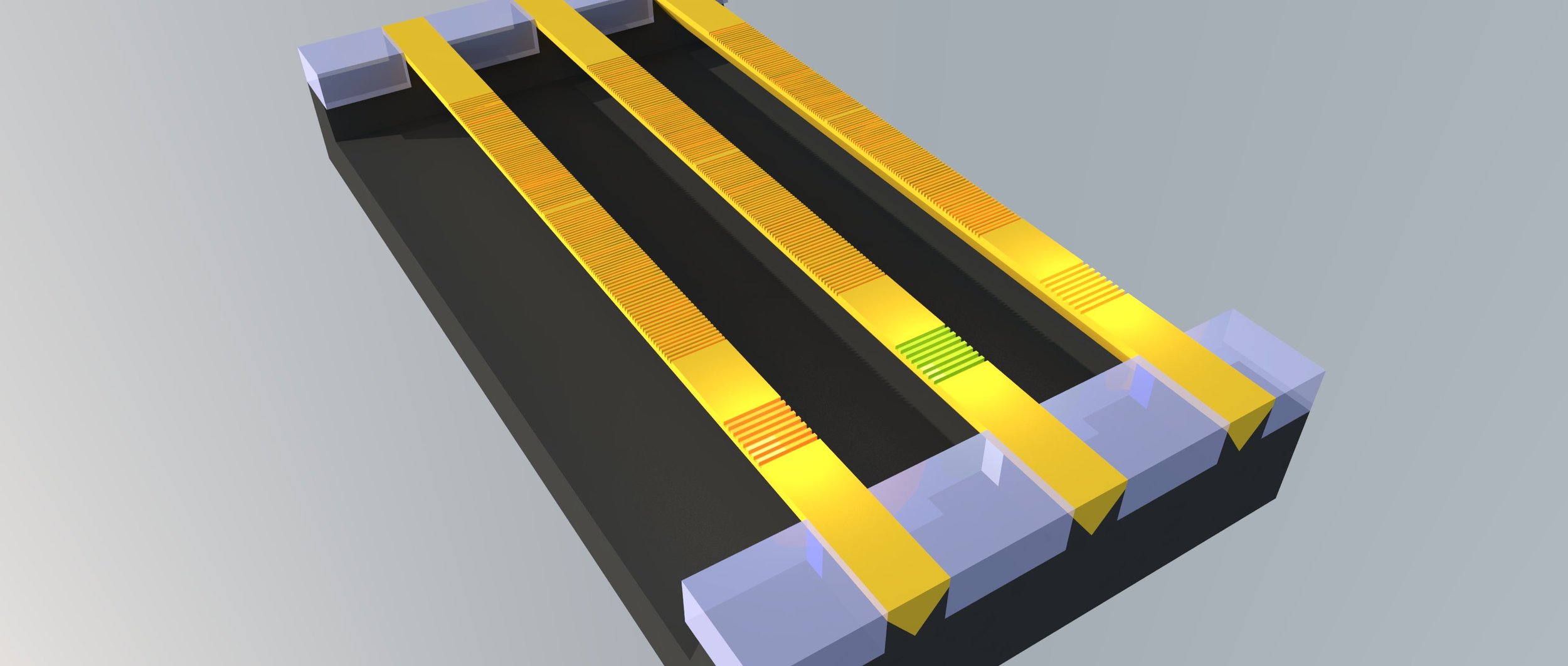 Shown are three v-shaped indium phosphide lasers and their gratings on a silicon-on-insulator substrate. Source: Ghent University, imec