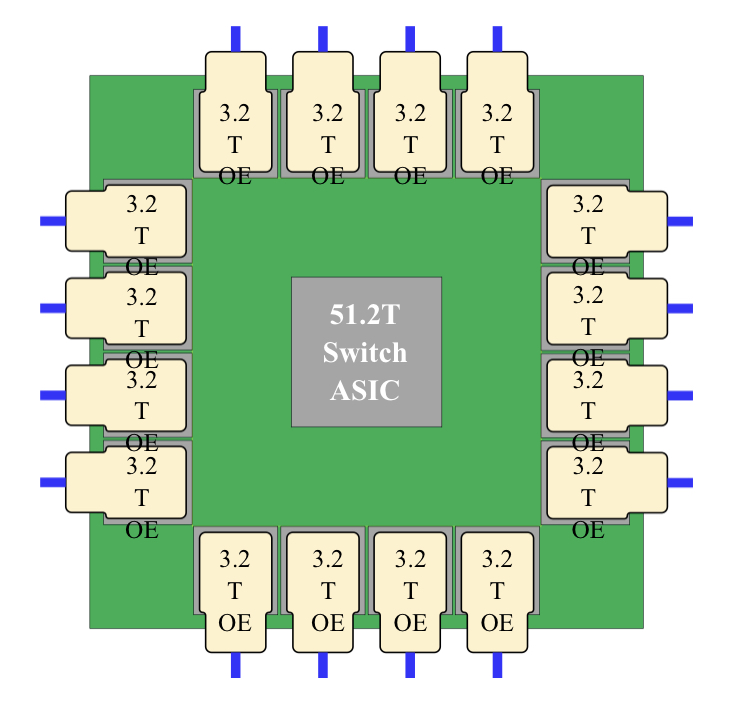 With co-packaged optics, the switch chip is typically surrounded by 16 optical modules, all placed on an organic substrate (see diagram below).