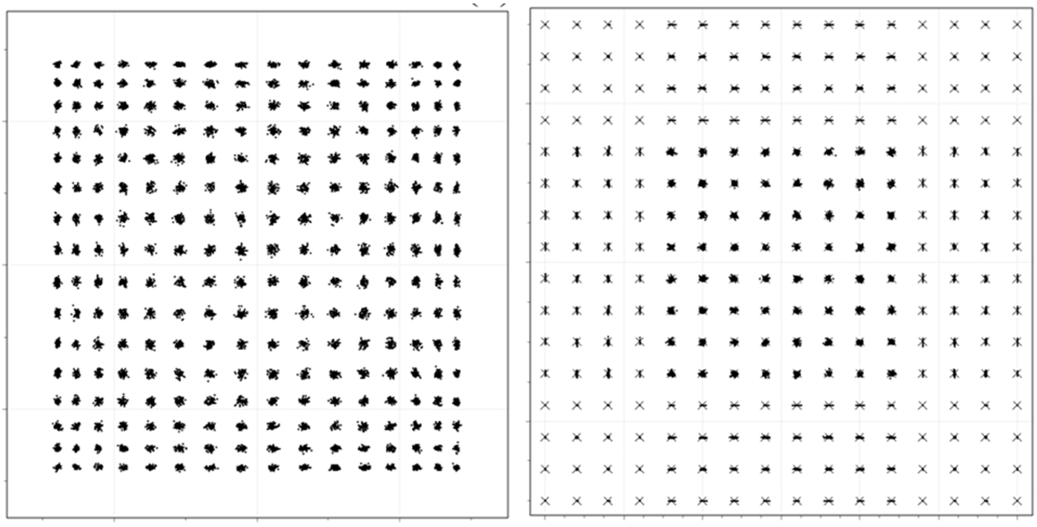 A 256-QAM constellation using a conventional coherent transmitter (left) and using the oDAC. Note there is no modulator loss (the full area is used) nor any optical warping using the oDAC. Source: Tomkos and Nazarathy.