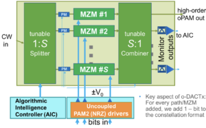 “The big picture is that we offload the electronics burden by going parallel optically,” says Nazarathy, adding that what is being traded is electronic DAC complexity and the associated performance limitations of the drivers for optical parallelism of replicated blocks of Mach-Zehnder modulators.