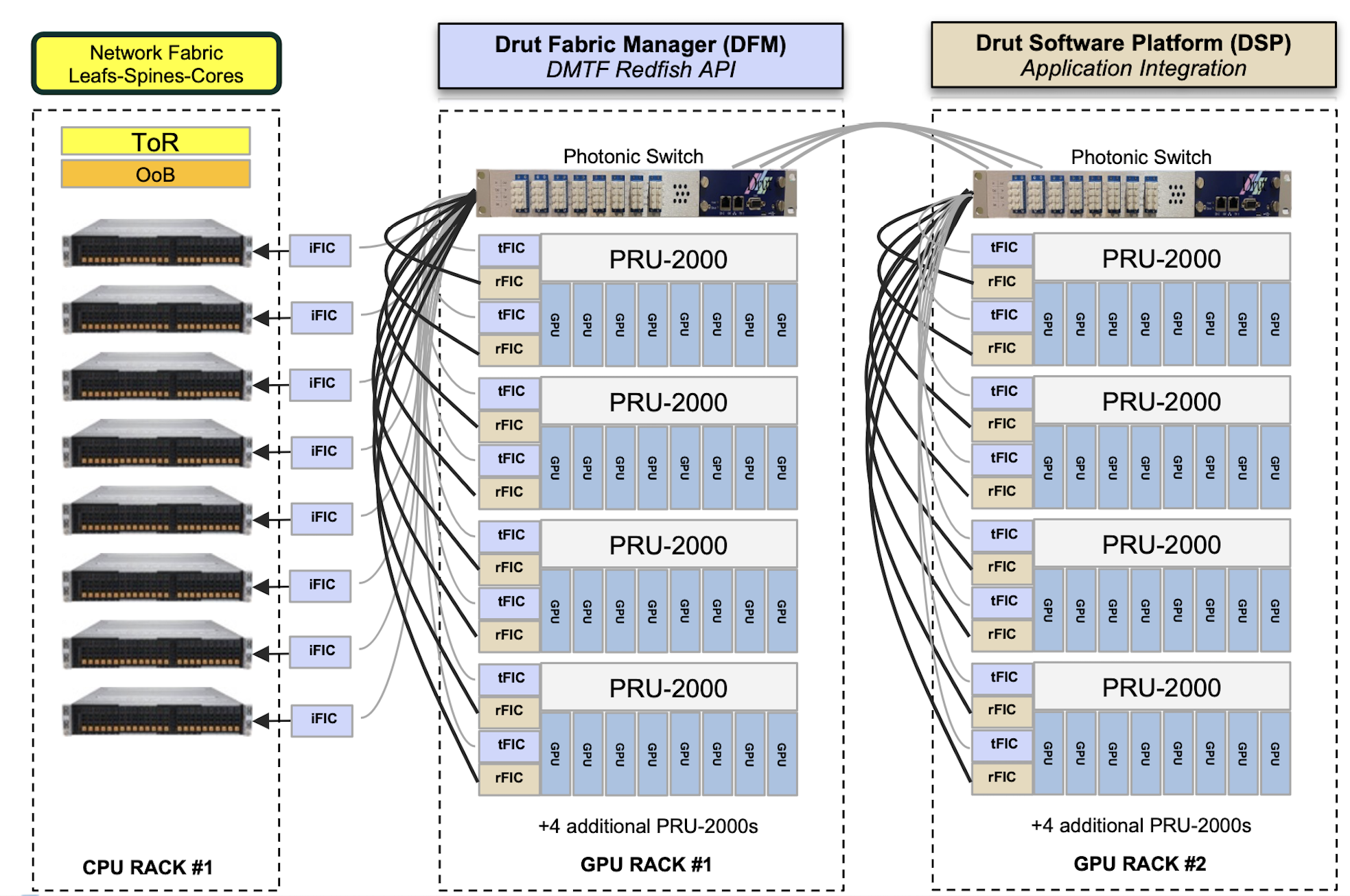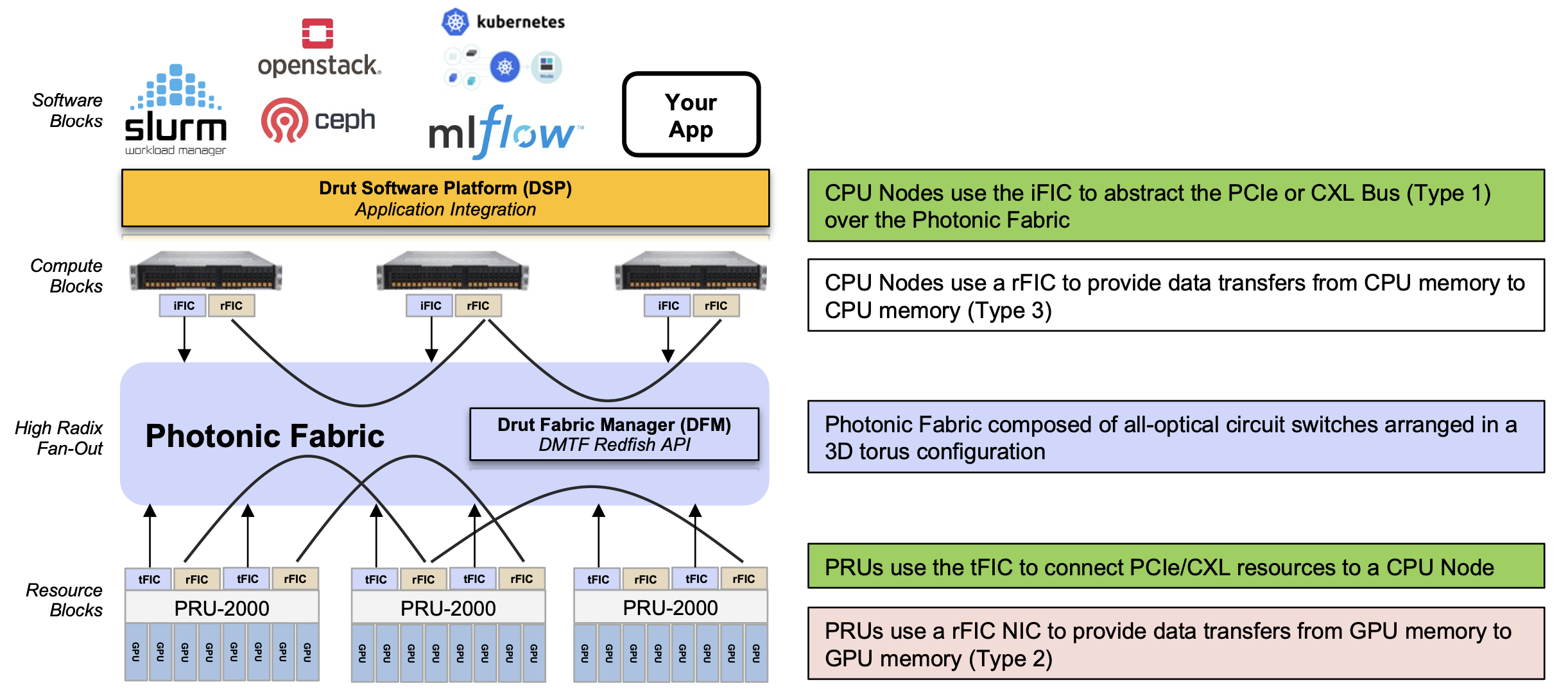 The core of the DynamicXcelerator architecture is a photonic fabric based on optical switches. This explains why Drut uses PCIe and RDMA protocols over optics.