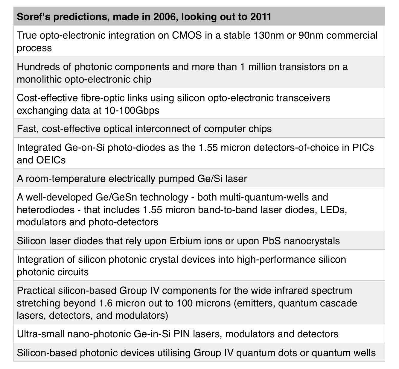 In your paper, The Past, Present and Future of Silicon Photonics, published in 2006, you say that no one can foresee the future and that all one can do is make educated guesses. You then go on and make the following predictions shown in the table below.