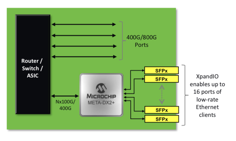 New packet processor designs have 112-gigabit serdes. If lower rate speeds are fed directly to the packet processor, bandwidth is wasted. Microchip’s XpandIO feature aggregates these lower rates to better match the packet processor’s serdes speed.
