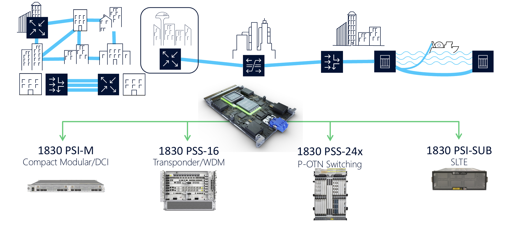 These include the 1830 PSI-M compact modular data centre interconnect, the 1830 PSS-16 transponder and WDM line system, the 1830 PSS-24x P-OTN and switching chassis, and the 1830 PSI-SUB subsea line-terminating equipment.