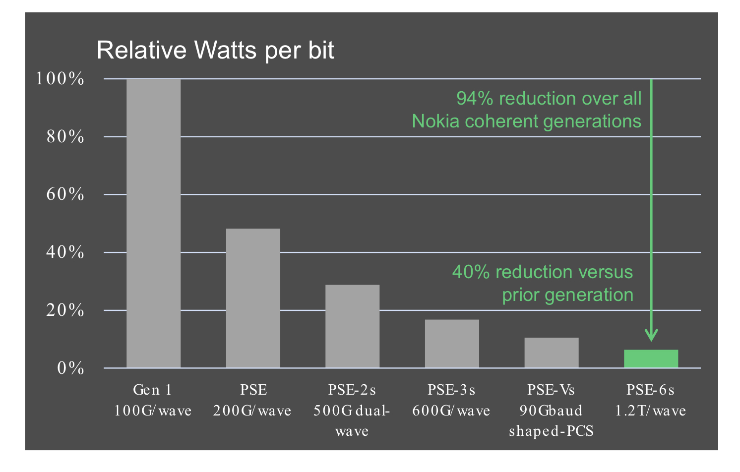 According to Nokia, the PSE-6s optical engine consumes 40 per cent fewer Watts per bit compared to the PSE-Vs.