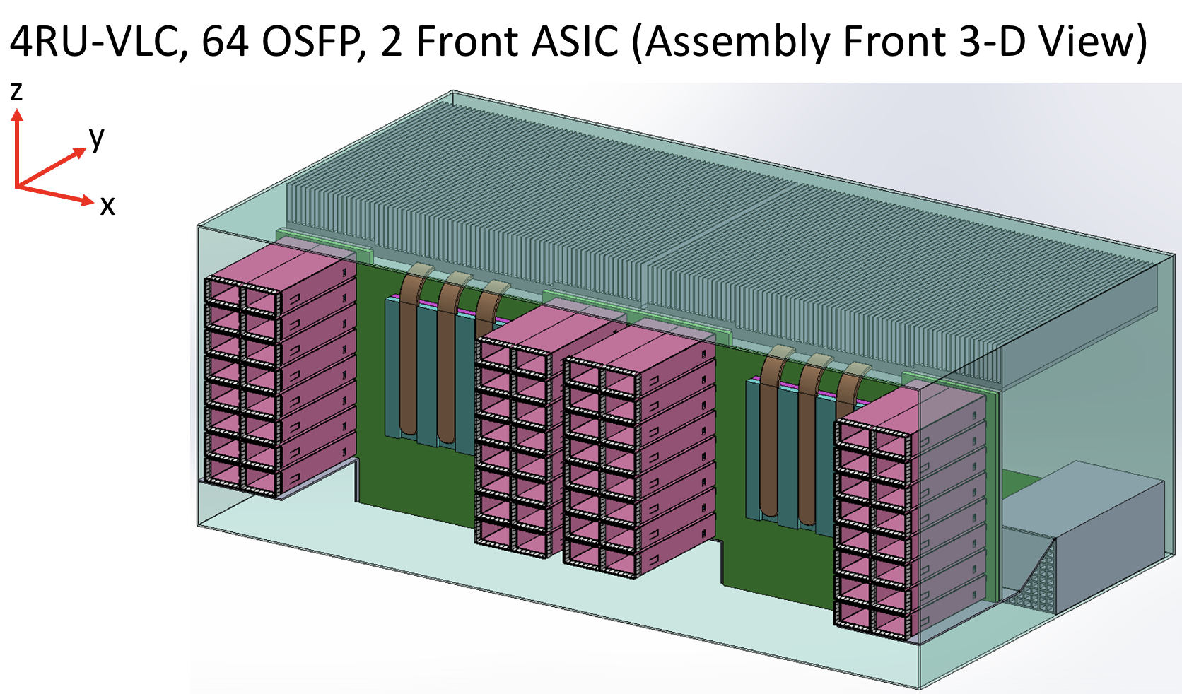 The airflow for the ASICs is improved, enabling more moderate air fans to be used compared to 1RU or 2RU horizontal card chassis designs. There is also airflow across the modules.