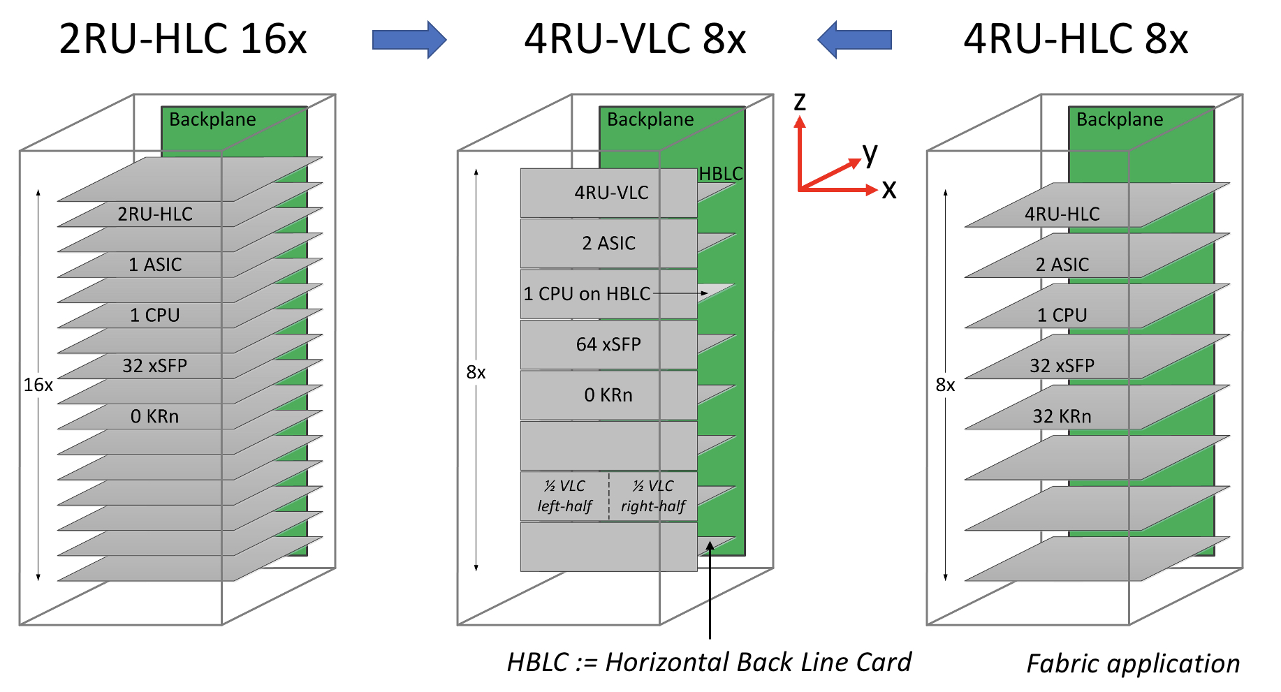 A 32RU chassis can thus support eight vertical cards or 16 ASICs, equivalent to the chassis with 16 horizontal 2RU line cards.