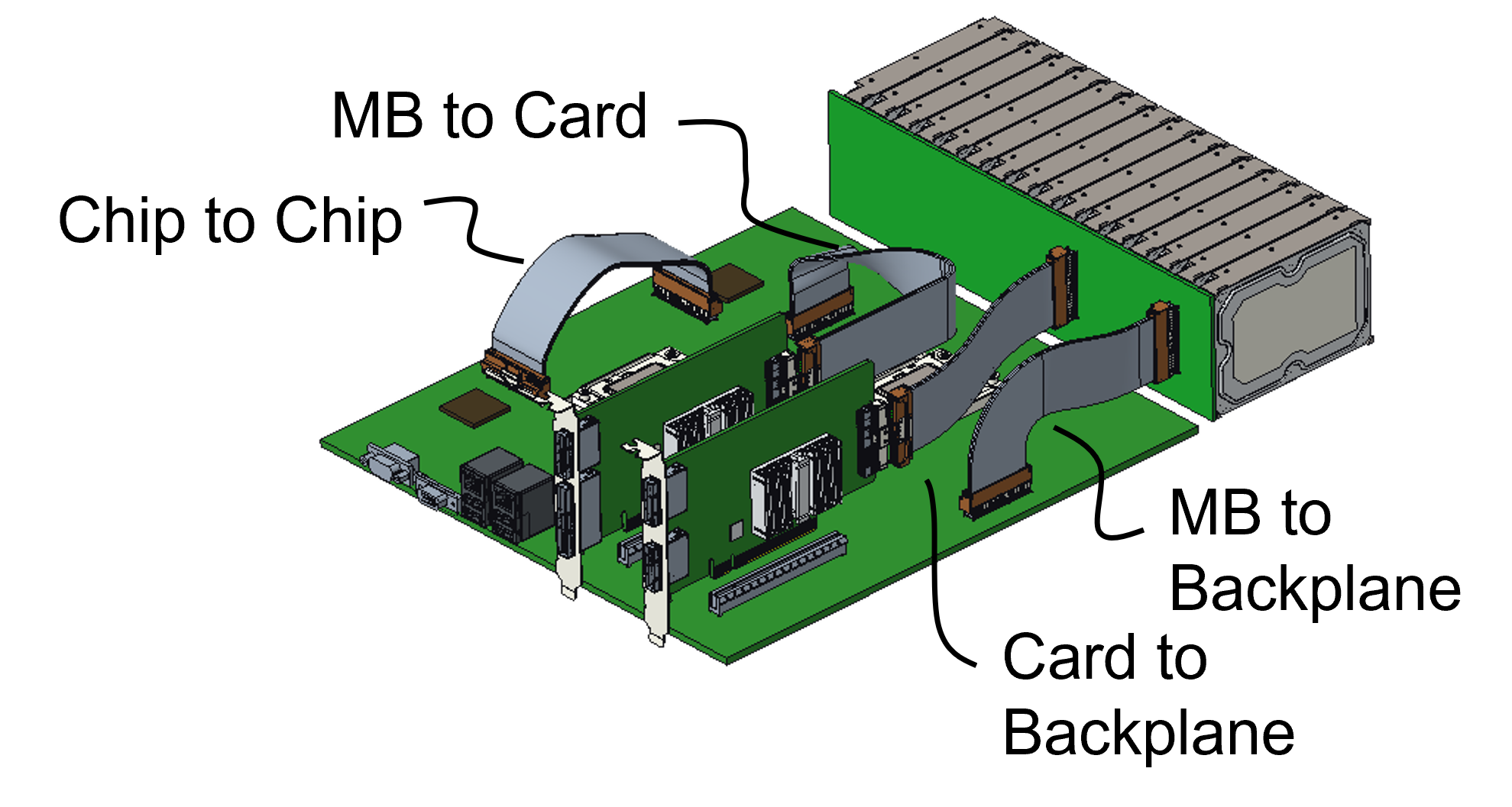 Since each generation of PCIe doubles the data transfer rate, PCI-SIG member companies want copper cabling to help with the design of high-speed PCIe interconnects on a printed circuit board (PCB), between PCBs, and between racks (see diagram).