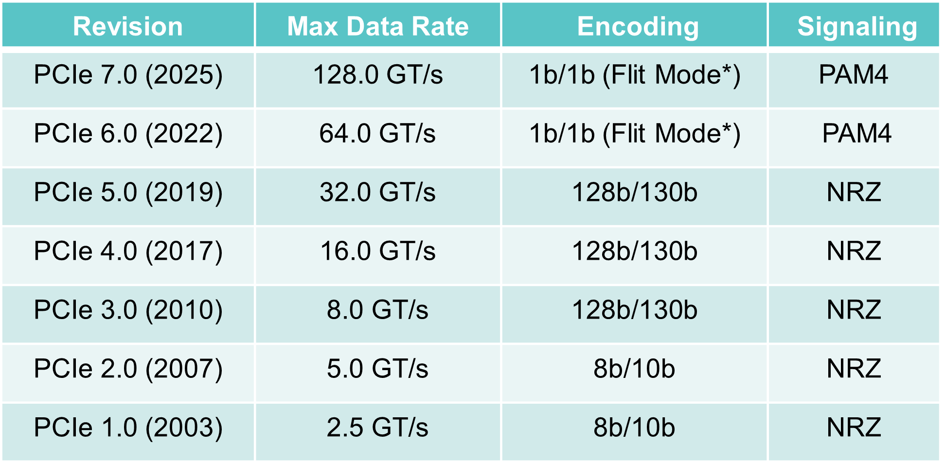 Since then, PCIe 6.0 has been specified, supporting 64GT/s per lane per direction. PCIe 6.0 is the first standard for 4-level pulse amplitude modulation (PAM4) signalling.