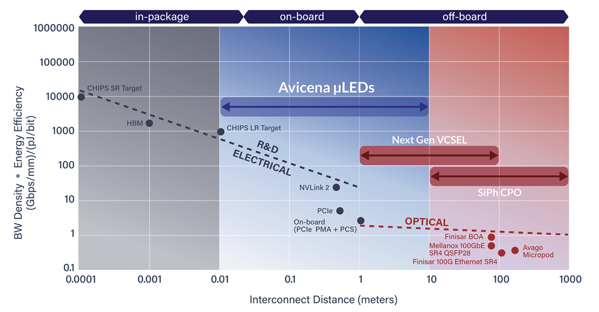MicroLEDs offer another category of optical interfaces alongside pluggable optical modules, on-board optics, and co-packaged optics (see chart below).